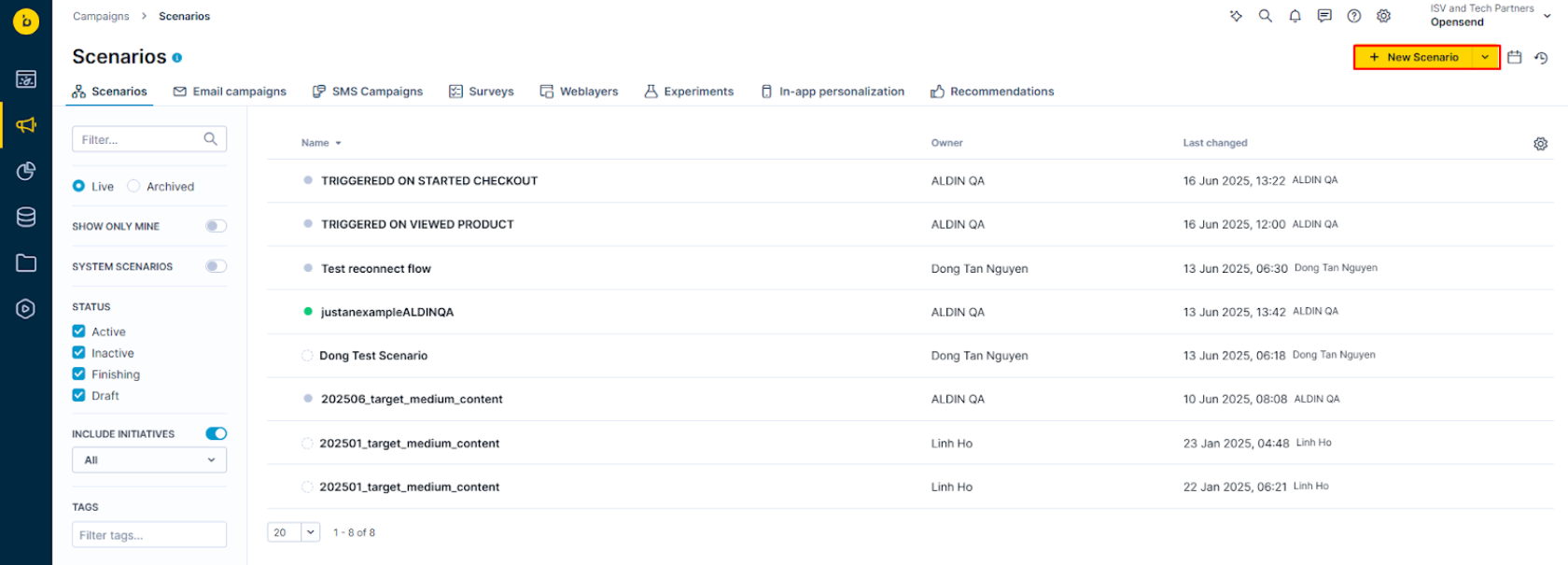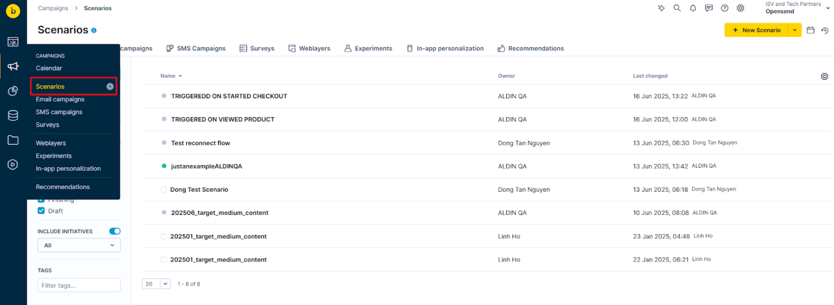 - When you are done creating all scenarios with Opensend Reconnect events and are ready to use the Opensend Reconnect, go back to the Opensend dashboard and find your Bloomreach Reconnect flow setup