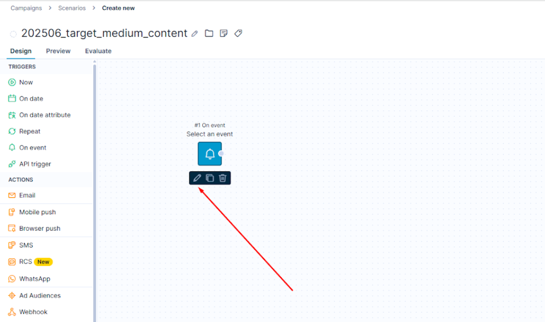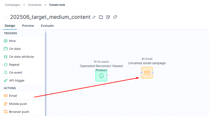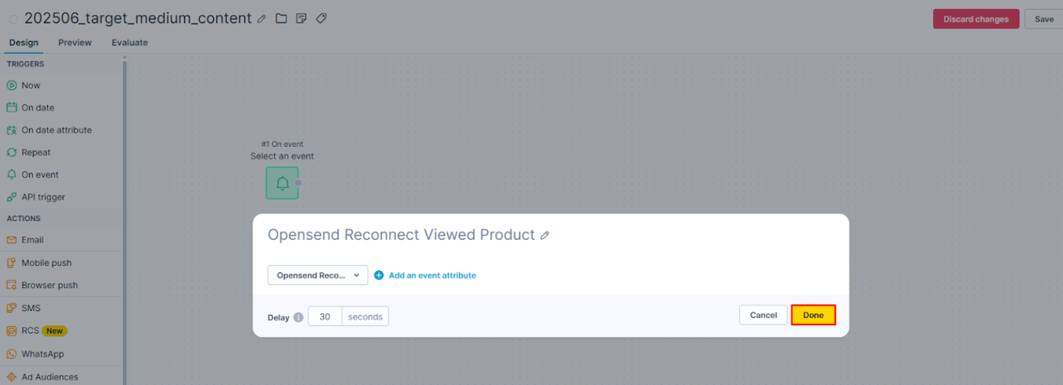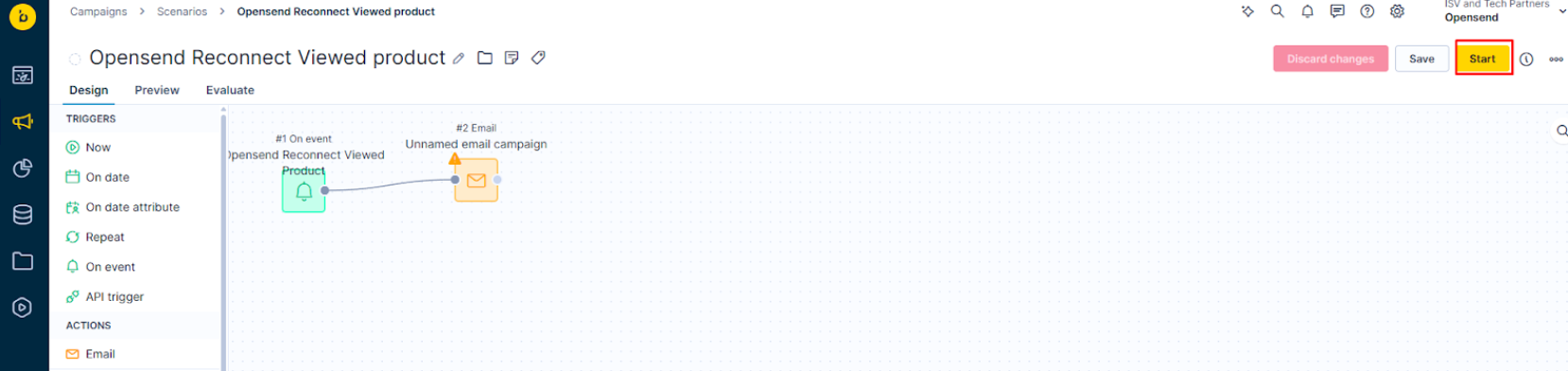 - Connect the Opensend Reconnect event (in this example, Viewed product) with your email campaign