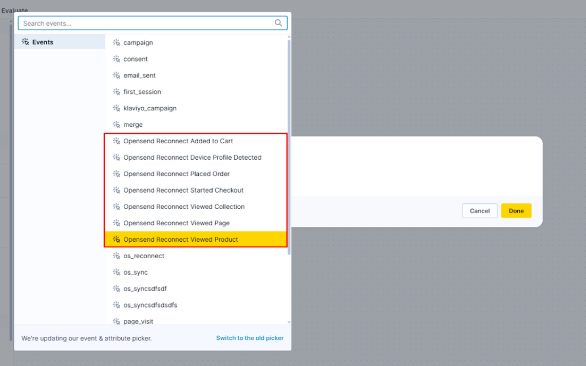 - Select one of the Opensend Reconnect events (for example, Opensend Reconnect Viewed product)