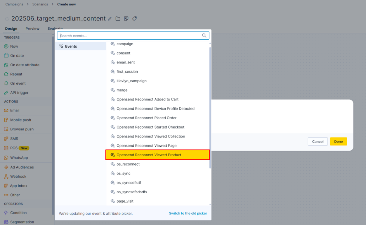 - You will see a list of generated Opensend Reconnect events that you can use to create an event-based scenario