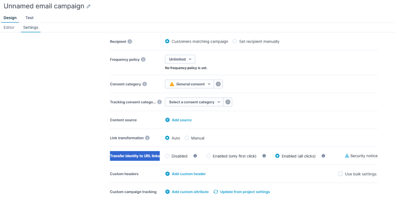 - In campaign settings, select General consent and “Enabled (all clicks) option for Transfer identity to URL links option