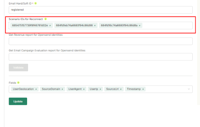 - Paste all of the created scenario IDs from previous step to the Scenario IDs for Reconnect field (You can find your scenario IDs in scenario URL as shown below: