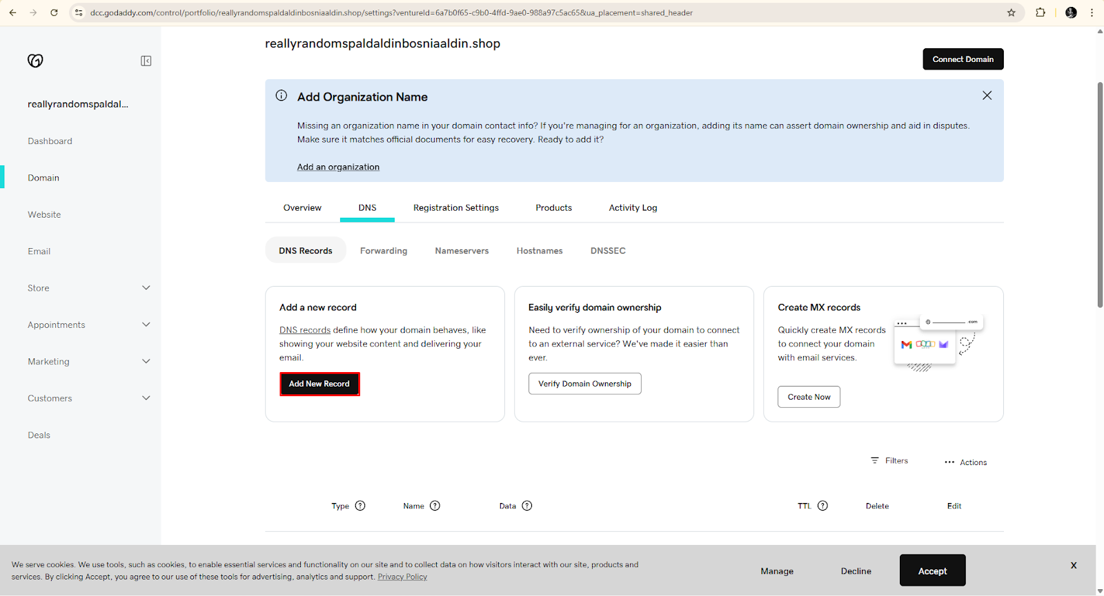 - Add a new record. In the Records section, click Add. Select CNAME from the Type dropdown.