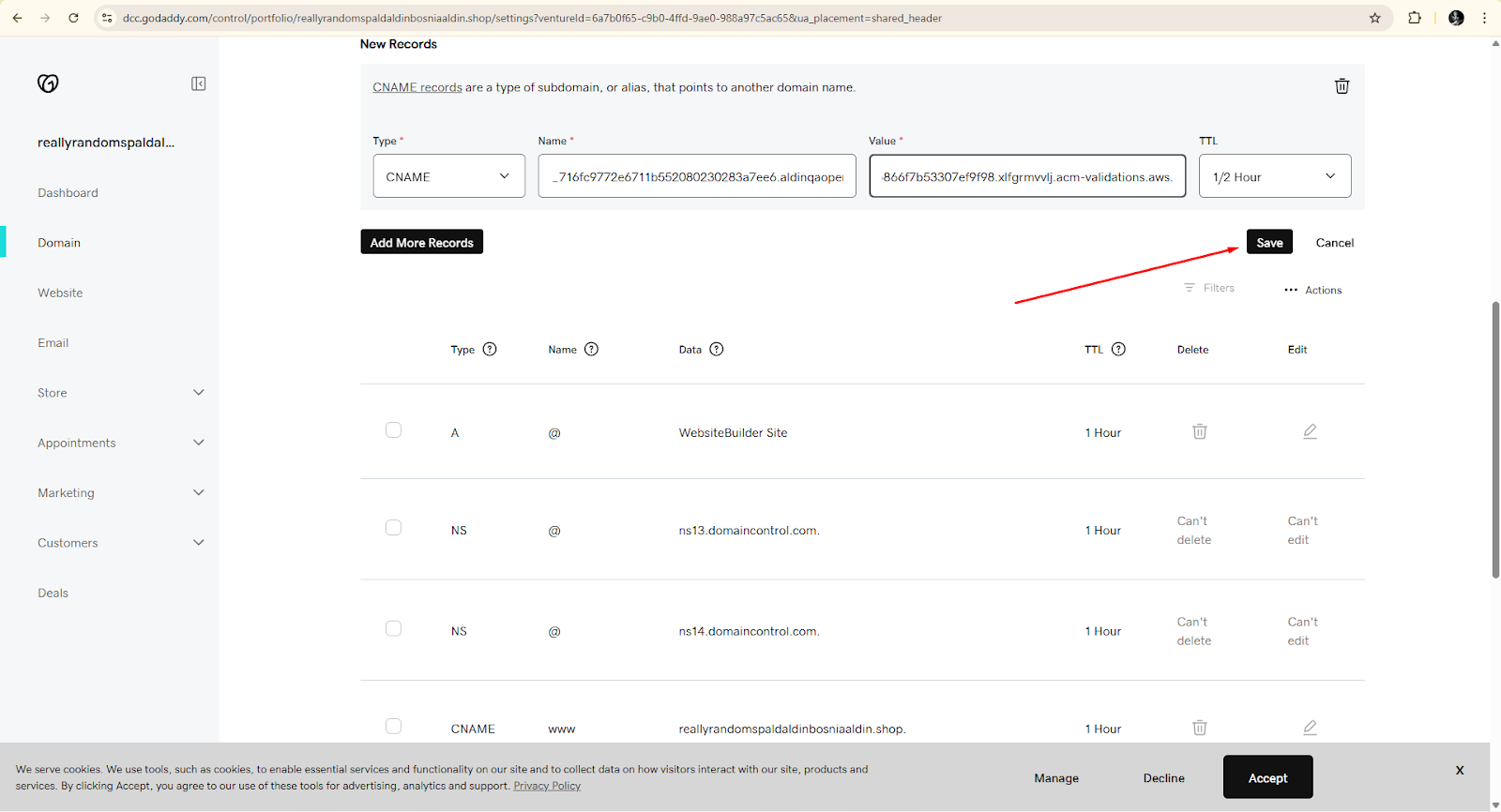 - Save your CNAME record. Click Save to add the record. Repeat these steps to add each of the three CNAME records.