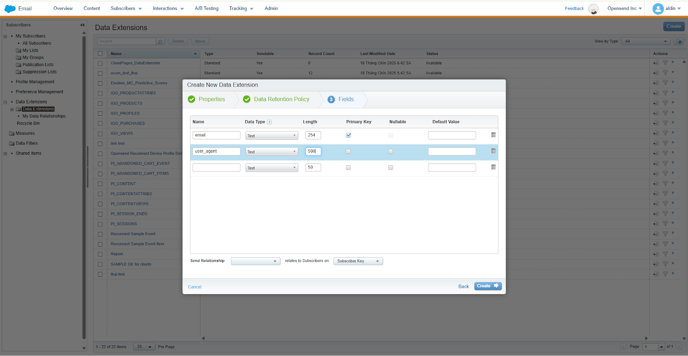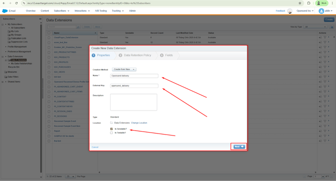 - Add name, external key, and tick “is sendable” checkmark in data extension settings