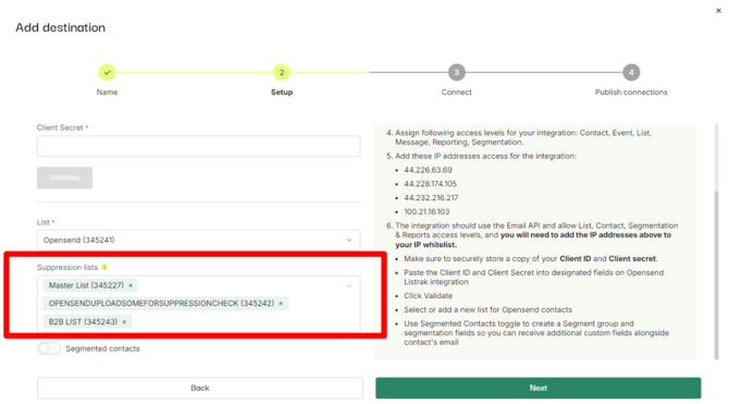 - Select lists that you want to suppress and Opensend won't deliver any contacts that already exist on these lists (If there is a master list where they generate all their contacts even better)
