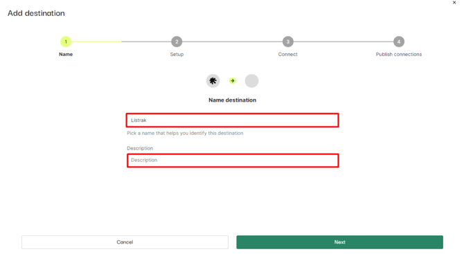 - Add a name and description for Listrak integration and click Next