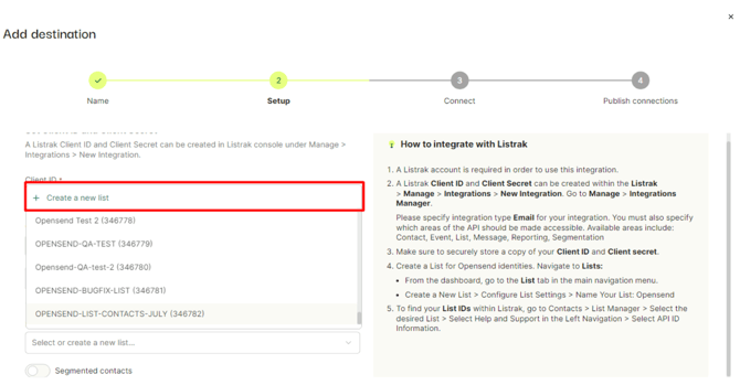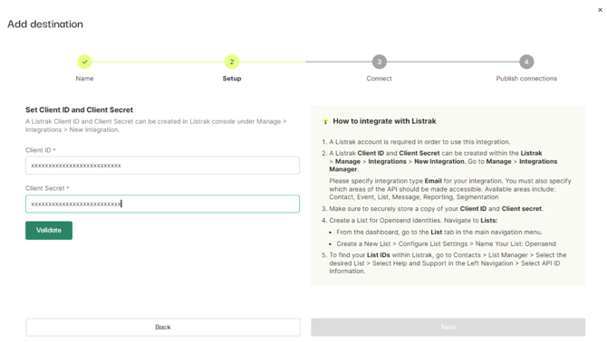 - Paste the Client ID and Client secret to the Opensend Listrak setup fields and click on the Validate button
