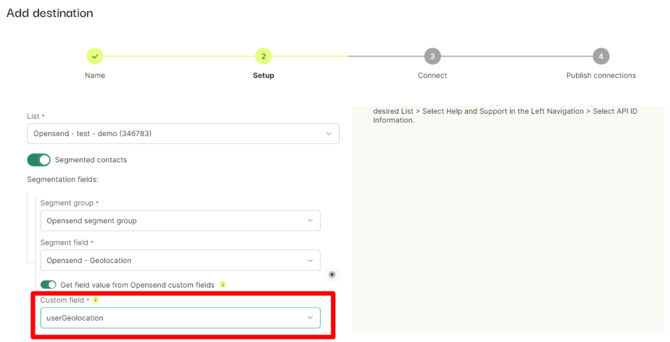- Click on the Add segmentation field button to add more segmentation fields and repeat the steps for any custom field you want to receive alongside the contact’s email (In the example above we have shown how to do it for UserGeolocation)