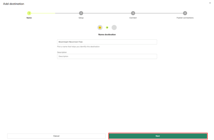 - If you prefer, change the name and puta description for your Bloomreach Reconnect flow destination, and click Next