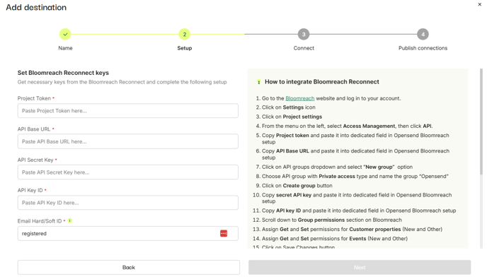- Enter the Email Hard/Soft ID in the designated field when setting up Opensend with Bloomreach. The default value is "registered," but if your Bloomreach account uses a different identifier for email addresses, provide that value in the Email Hard/Soft ID field.