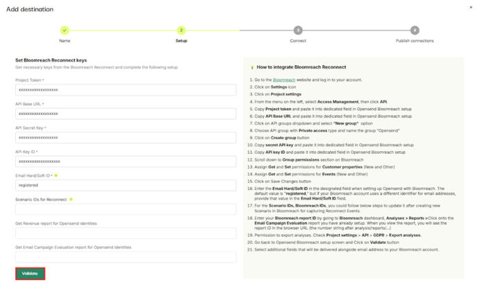 - Copy the secret API key and paste it into the dedicated field in the Opensend Bloomreach setup