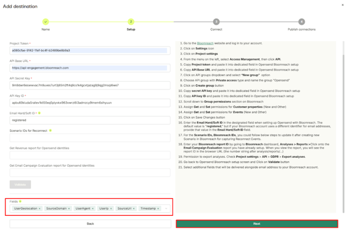 - Select additional fields that will be delivered in the Opensend Reconnect events to Bloomreach and click Next