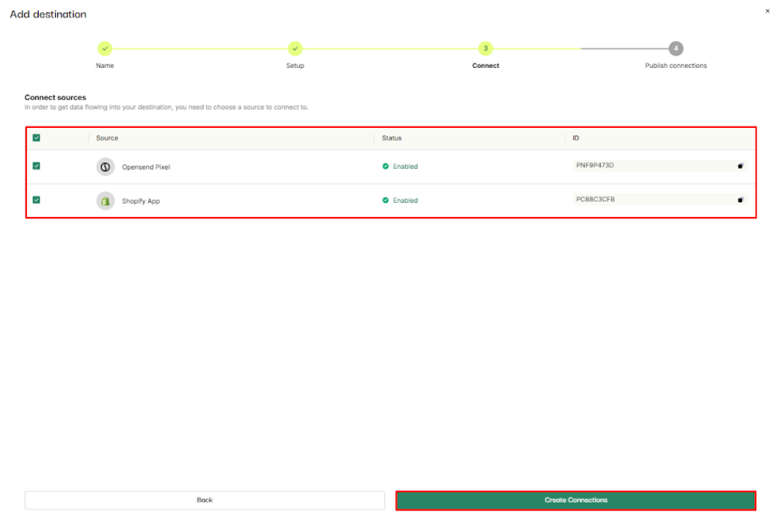 - Select the Traffic sources to connect with the Bloomreach Reconnect flow and click on the “Create connections” button
