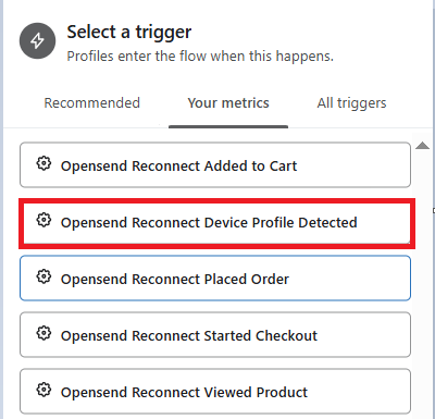 Once you are ready and live with the first flow, with the Opensend Reconnect Device Profile Detected trigger on Klaviyo