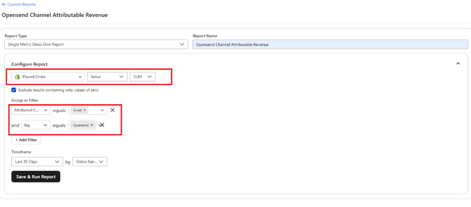Result: The report will show total revenue from Placed Orders attributed to Email where the tag is Opensend.